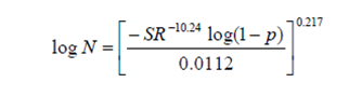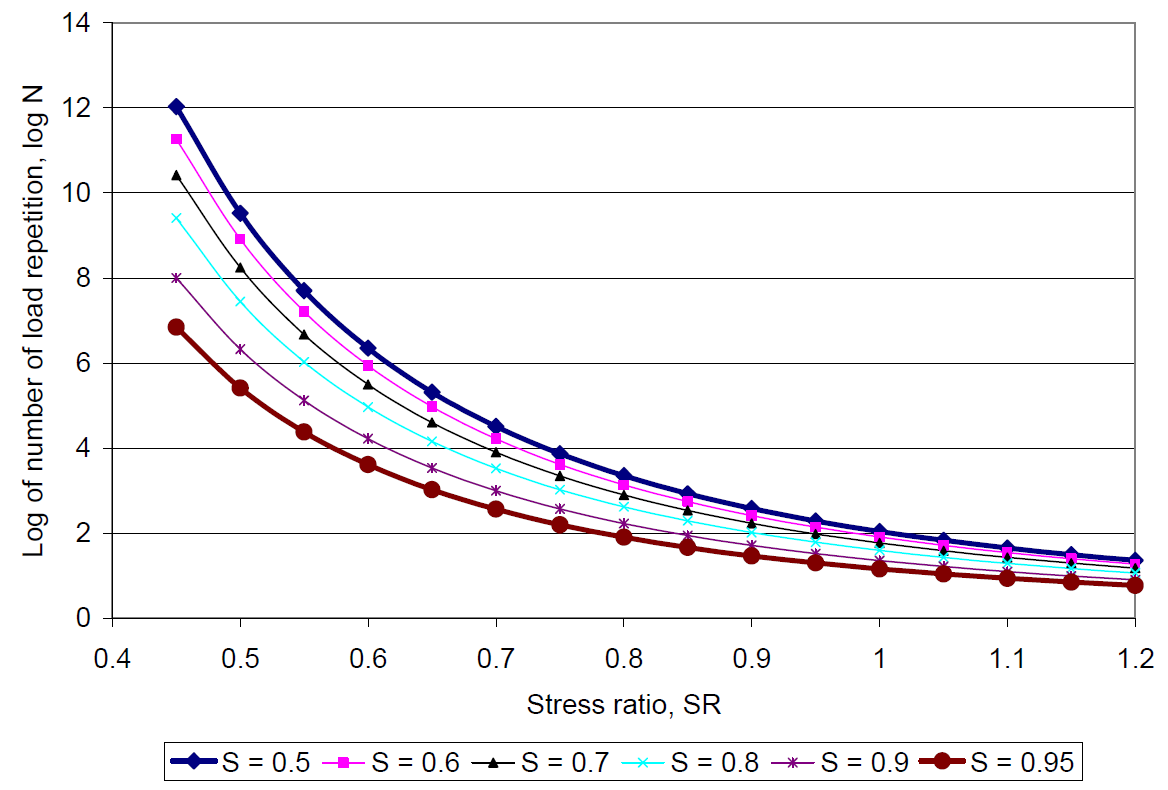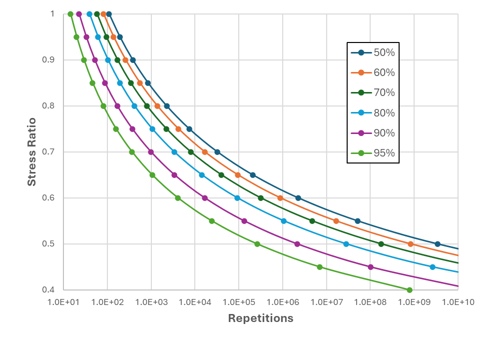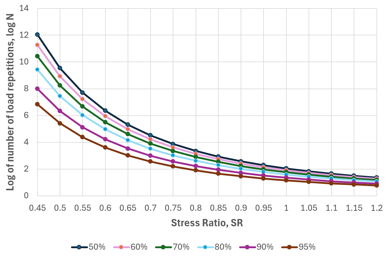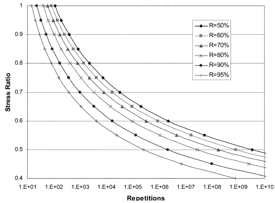 Further confirmation comes from Figure A.3 from ACI 330R-08, where again results can only be replicated with a base 10 log in the reliability part of the fatigue equation, as shown in the following plots; see the Excel section for more details.