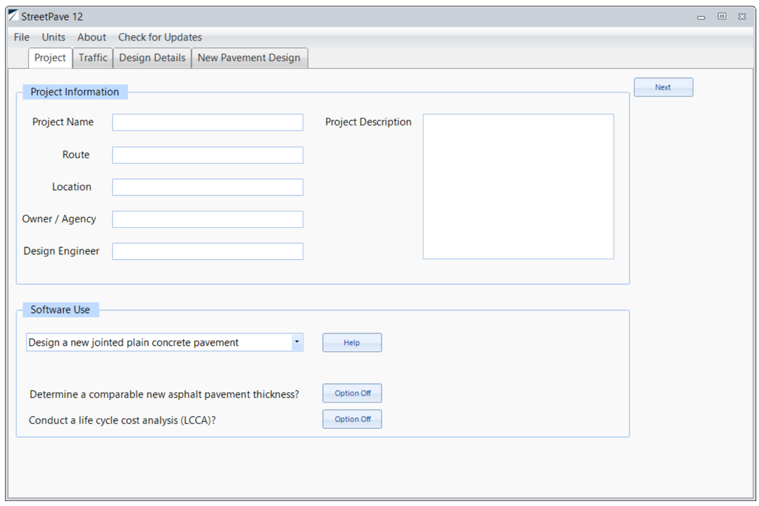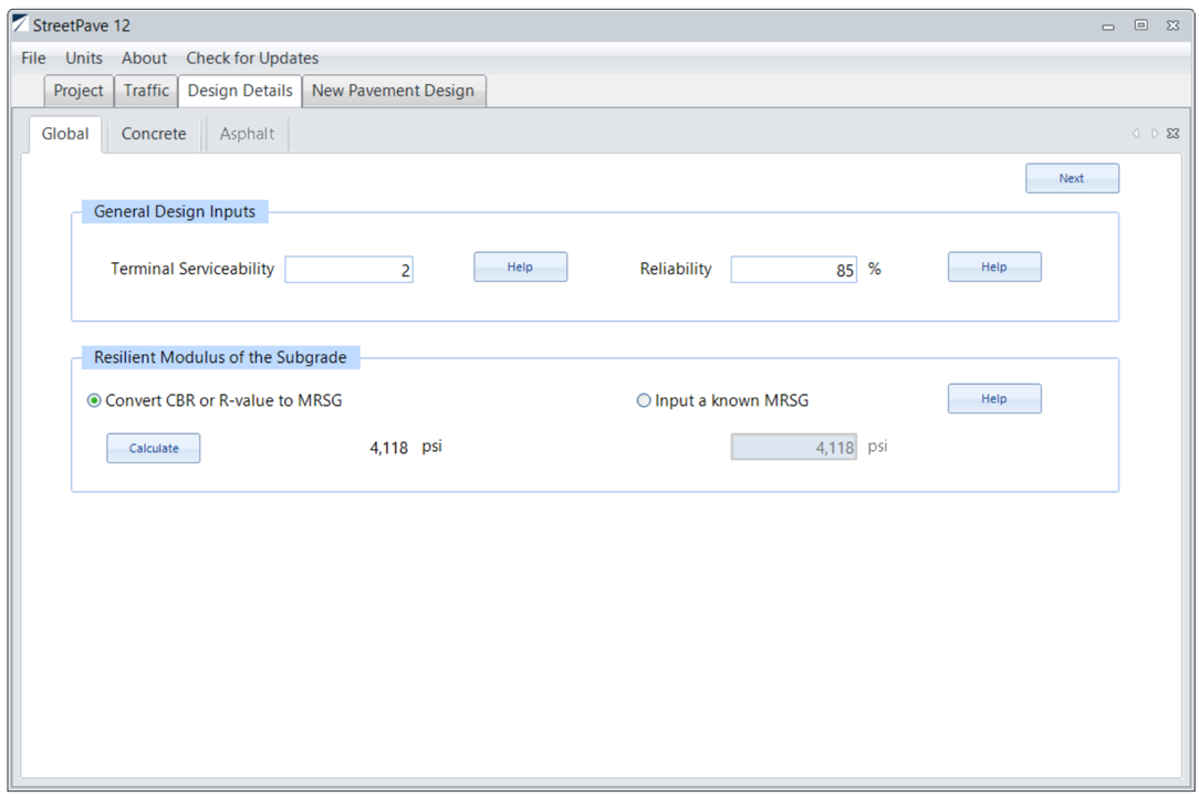 The following screenshots show the selections, inputs, and results for a design run in StreetPave12.