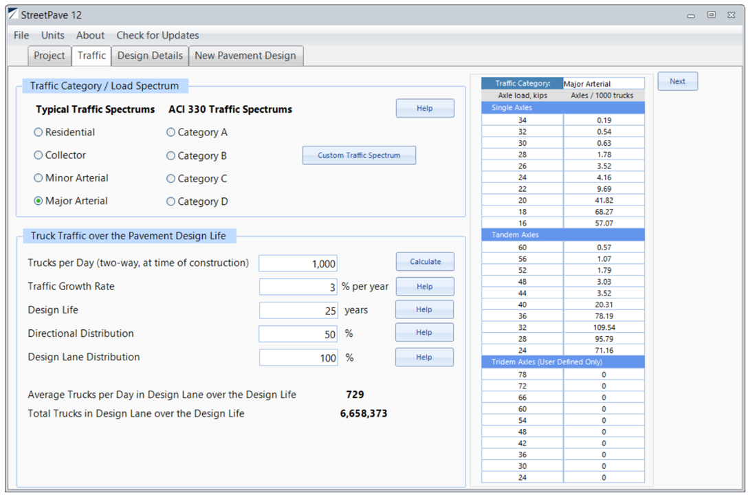 This series of calculations is repeated for each axle type and load, and the fatigue damage from each axle load is summed to yield the total fatigue damage. In practice, StreetPave12 increases the slab thickness until the total fatigue damage is under 100%.