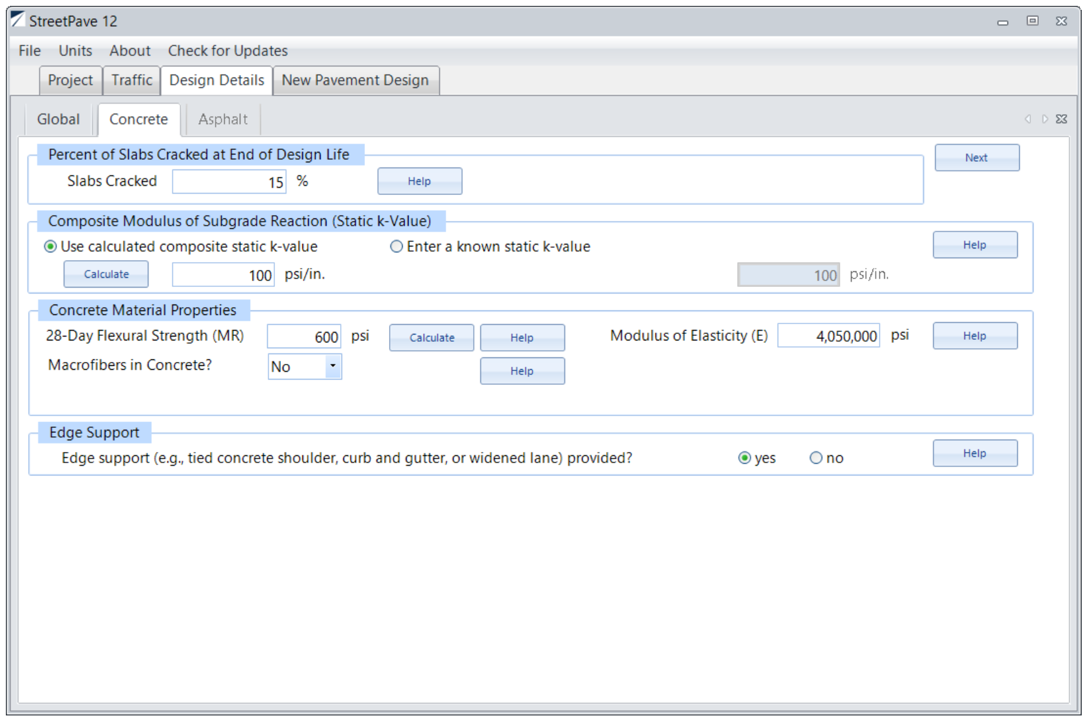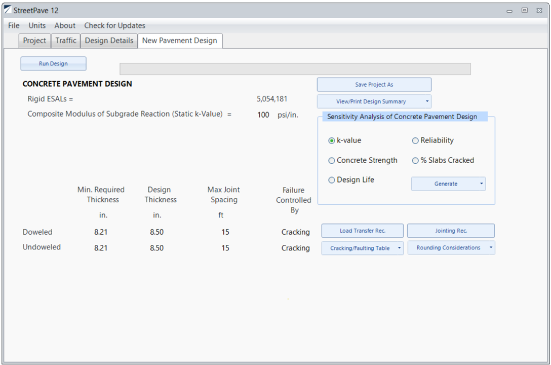 The pavement will use 600 psi flexural strength concrete, which has an estimated concrete elastic modulus of 4,050,000 psi, a Poisson’s ratio of 0.15, a strength coefficient of variation of 15%, and no fibers. This 25-year design is at 85% reliability and with 15% slabs cracked at the end of the design life. The pavement will be built on a k-value of 100 psi/in. with edge support. In the StreetPave12 Example, it is shown that the required thickness is 8.21 in.
