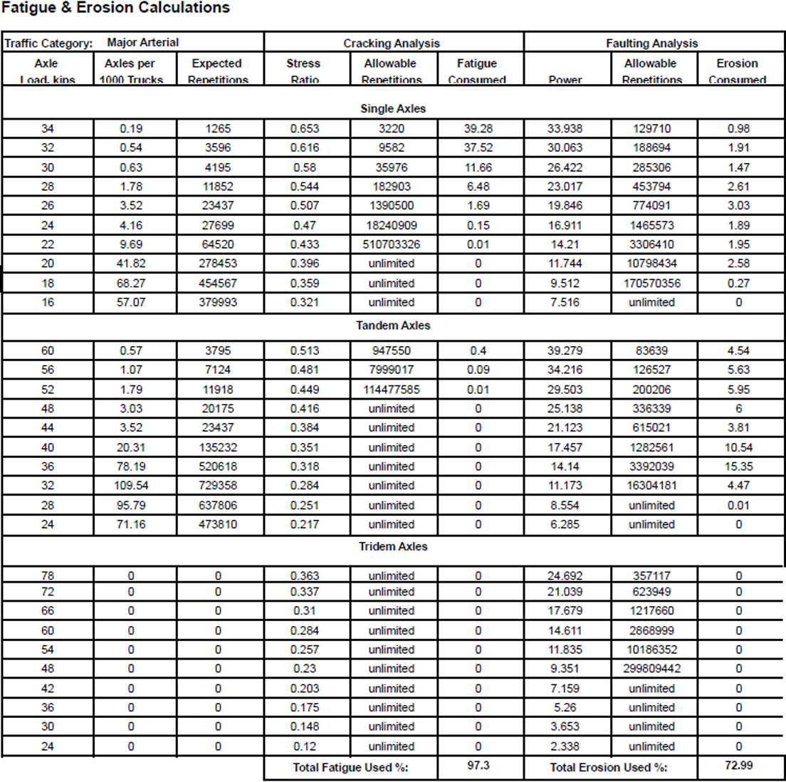 Again, the value is off 0.01% versus the example in the next section because of rounding. This series of calculations is repeated for each axle type and load, and the erosion damage from each axle load is summed to yield the total erosion damage. In practice, StreetPave12 increases the slab thickness until the total erosion damage is under 100%.